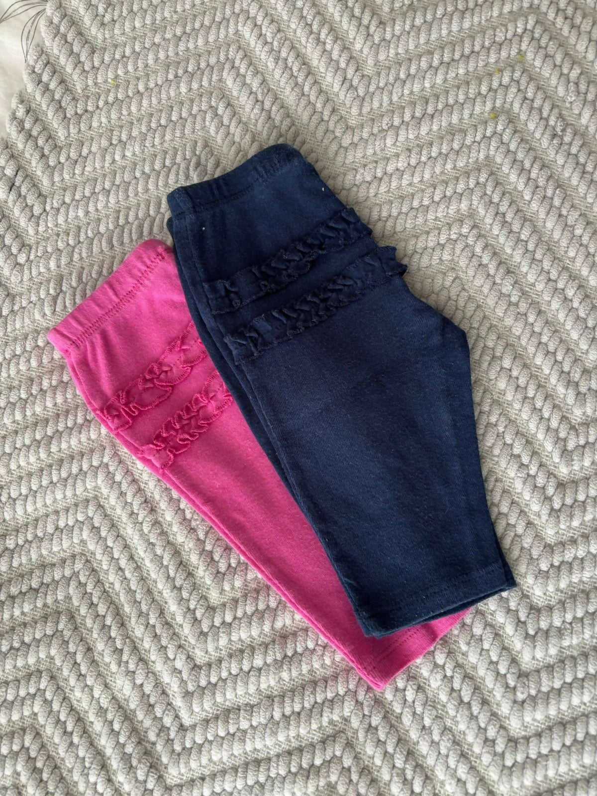 - Pack compuesto por dos calzas de algodón de color azul y rosado con vuelos.